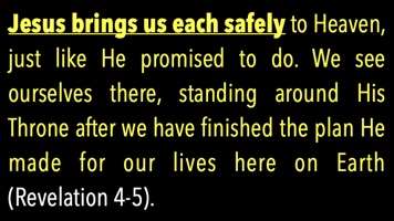 So, Jesus brings us each safely to Heaven, just like He promised. We see ourselves there standing around His throne after we've finished the plan He made for our lives here on Earth. See, God has a plan for you and for me. He made us a specific way. He put us in a specific family. He made us look like we look, everything you can't change about yourself, like who your parents are, how rich or poor they are, what side of the tracks you lived on, all of that stuff, what you look like, they didn't pick that, and you didn't pick that. God picked that, and it's part of His plan, and there's something you can do, nobody else can do.