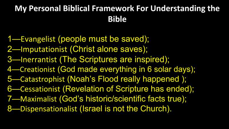 This is my personal biblical framework. So, if you wonder where I come from, I would say, number one, I'm an evangelist. Remember, Paul said, do the work of an evangelist. I believe people need to be saved. Nobody's born saved. They're not in the covenant because their parents baptized them and did whatever when they were little. I'm an imputationist, that only Christ can save, and He saves us by imputing, by placing upon us His righteousness and taking our sins upon Himself. I'm an inerrantist. I really believe the Scriptures are inspired. By the way, all of them. I'm a creationist. God made everything in six solar days.