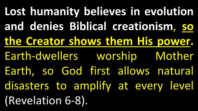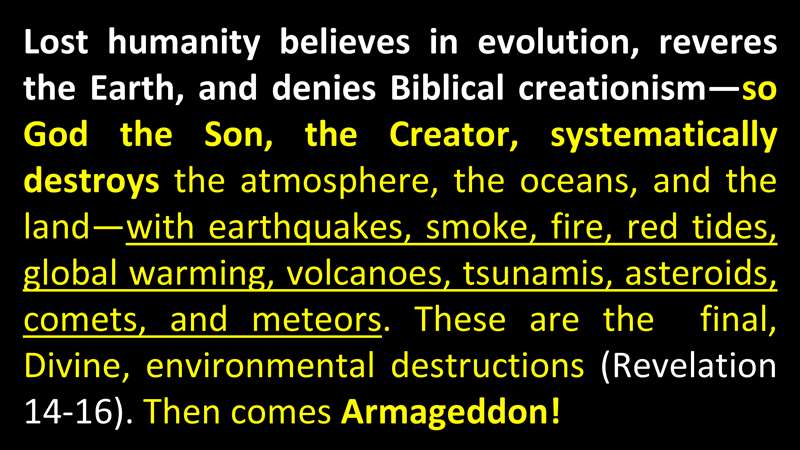 Lost humanity believes in evolution, reveres the Earth, and denies biblical creationism. So, God, the Creator, systematically destroys. Now, it becomes unnatural. It's supernatural destruction, and God sends earthquakes, the strongest that have ever hit the Earth. Smoke and fire, red tides. Everything in the ocean dies. Have you ever been in South Florida or anywhere else they, have it? It's where the red tide comes, and every week, a new level of sea creatures are dying and rotting on the beach and stinking. The whole world will be like that. Tsunamis, volcanoes, asteroids, comets, meteors. The final divine environmental destruction sits in Revelation 14 to 16. Then Revelation 16 ends with Armageddon.