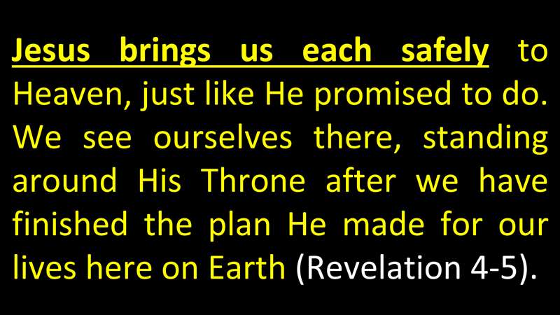 In Revelation 4 and 5, Jesus brings us each safely to Heaven. We see ourselves around the throne. We are standing around the throne. We've finished the plan God made for us, and we have these crowns, which are a distillation of our lives for the Lord.