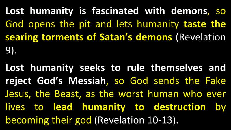 Lost humanity is fascinated with demons, so God opens the pit. He actually lets humans taste the torments of Hell in chapter 9. For all those who love demons, Apollyon, the destroyer, a lot of them have made their way into gaming. They're actually names, Greek names of Greek gods that are demons that people are entertained with in gaming. God says, you like the game? I'll show you the real thing.