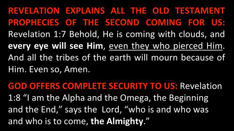 Revelation explains all the Old Testament prophecies. I told you it quotes it 800 times. It's going to be fascinating going through this with you. Everything that you wonder and puzzle about in the minor prophets and the major prophets is illustrated with a picture in Revelation, and Jesus offers Himself. Look at the last word of verse 8. He calls Himself the Almighty. It reflects the Old Testament word El Shaddai because that's from the book of Job. But the Greek word that it reflects is the fact of the all-powerful One. In fact, in Jude, the word is used as pantokrator, pantos all, kratos power. He is the almighty One. That's where we have security. So, that's the plan of God.