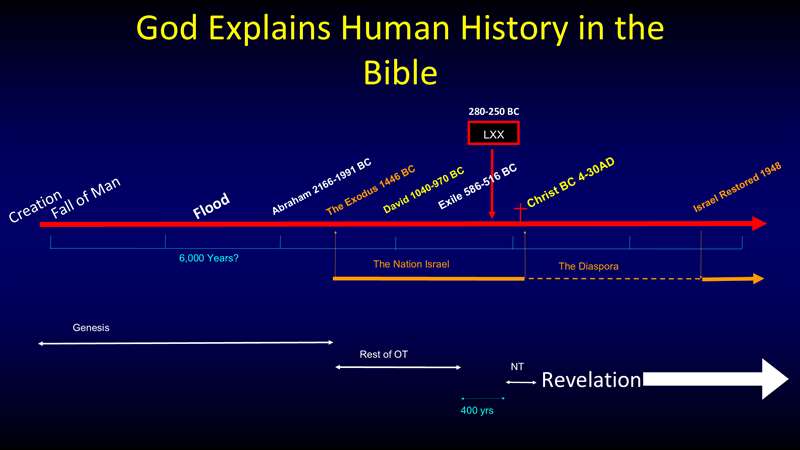 In fact, God explains human history. Now that's way too many things for you guys to see, but this is the history according to the Bible: creation, the fall of man, the flood, Abraham, all the way through to Israel in 1948. Look at the book of Genesis. Does Mark Strout still teach Genesis? Yeah. Look at this! Genesis covers more space than the other books till we get to Revelation. It's unbelievable. Then we have all the rest of the Old Testament, which goes from the Exodus through the Exile. Then we have the 400 years of silence, the Intertestamental Period. Then we have the New Testament, and then the ending of the New Testament gives us the history that goes to the end. It picks up with John on Patmos, and it goes all the way to the end. So, it's very exciting.