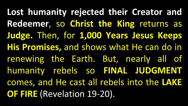 Then we come to the final event. Lost humanity rejects their Creator and Redeemer, so Jesus, the King, returns, sets up His kingdom, and nearly all humanity rebels. The final judgment, they're cast into the Lake of Fire.