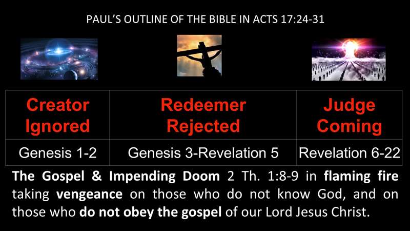The Bible is outlined by Paul in the book of Acts, chapter 17, as three parts. Genesis 1 and 2 introduce an ignored Creator. The Redeemer is rejected from Genesis 3, the fall, all the way through Revelation 5. The coming Judge, that's what we're seeing in Revelation. Paul shared the Gospel with the flavor of impending doom. It's one way you can share the Gospel.
