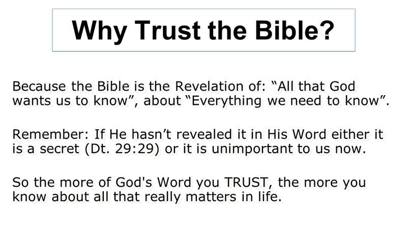 Why do we trust the Bible? Number one, the Bible is all that God wants us to know about everything we need to know. It's not everything possible to know. It's everything God wants us to know. Are you interested in what most people are interested in? What isn't in the Bible? If I talk about aliens, everybody's all about aliens, UFOs, flying saucers, and all that. People don't know about that. Did you know that actually is in the Bible. But most people are interested in the peripheral stuff.