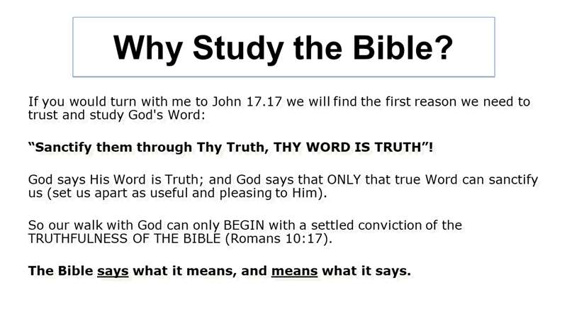 Why do we study the Bible? Here's the bottom line of why we have this class. God's word sanctifies us, John 17:17. Did you know, going through any class in the Bible Institute should cause sanctification.