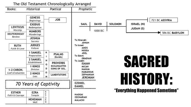 Secondly, the next slide, sacred history. Here's the book of Proverbs right here. Here's the book of Proverbs, in a timeline. King Saul, King David, Solomon, then Solomon's son Rehoboam and Jeroboam split the kingdom into the northern kingdom and the southern kingdom. Remember Rehoboam who did follow the bad example of his father? So, Proverbs was written right here in Solomon's time. Look what is parallel to it, during the time of the book of 1 Kings and the prophets, Isaiah, Micah, Nahum. Right in here, this is the time period. So, sacred history is everything happens some time. Sacred geography is everything happens somewhere. Sacred history, everything happened sometime. That's just a quick thumbnail of sacred history.