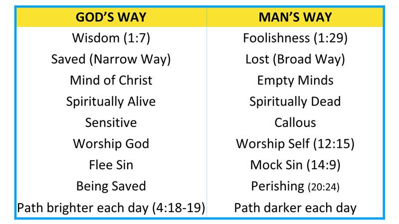 So basically, look at the next slide, the book of Proverbs confronts us with God's way and man's way. God's way - He offers wisdom, when we know Him, we're saved, and we start walking down the narrow way. We received the mind of Christ. We're spiritually alive. Sensitive. Worship God. Flee sin. We're being saved and the path gets brighter every day. Wow.