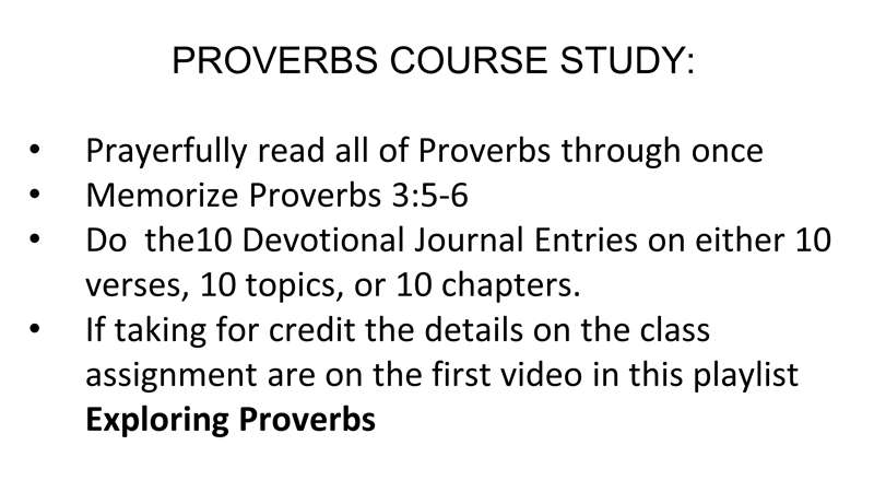 Now, this is the assignment sheet. Here are the first three that all of us, whether we're enrolled or not, have to do. But for those of you that are enrolled there is a point system. Your grade is based on a basic hundred percent points, 20 points are reading the book of Proverbs, the 10-chapter projects are half the course grade, learning the verses 10 points, the two quizzes over class notes, I'll explain that, and the final exam are the rest.