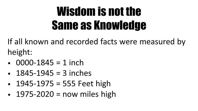 Now the next slide, wisdom is not the same as knowledge. If you look up from your slide for a second, let me show you something here on the marker board. If we were to illustrate all of human knowledge from the beginning, from the garden of Eden through the year 1845, and then from 1845 to 1945 it would be this one inch. If we could just measure all recorded knowledge, it would be one inch high. From 1845 to 1945 knowledge tripled. So, it would go from one inch to three inches. But from 1945 to 1975, now we're talking about the computer age. Then we'll go to the present. Do you know how much knowledge has grown - if in 1945 they had three inches of knowledge? 555 feet, that's like the Washington monument. Now that isn't even exponential, there has been an explosion of facts. Facts. A lot of facts. Triple the amount of facts. An almost in comprehensible amount of facts when we started doing radio telescopes and computers and nuclear research with cyclotrons and everything else. Look in the present, knowledge is doubling about every three year. Facts are doubling right now. It would be miles high, the stack of knowledge.