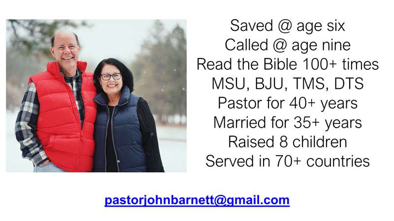 Now, for just a moment, I want to introduce myself as the one that's talking to you. You can see on the slide, I was saved at age six, called to the ministry at age nine. I've read the Bible over a hundred times. I've attended and gotten degrees from: I went to Michigan State, got a master's and bachelor's degrees from Bob Jones, was a faculty member at The Masters Seminar, got my doctorate from Dallas Theological Seminary. I've been a pastor for over 40 years, married to my wonderful wife, Bonnie for more than 35 years. In fact, we just celebrated our 38th anniversary. We've raised eight children. I've served in over 70 countries around the world.