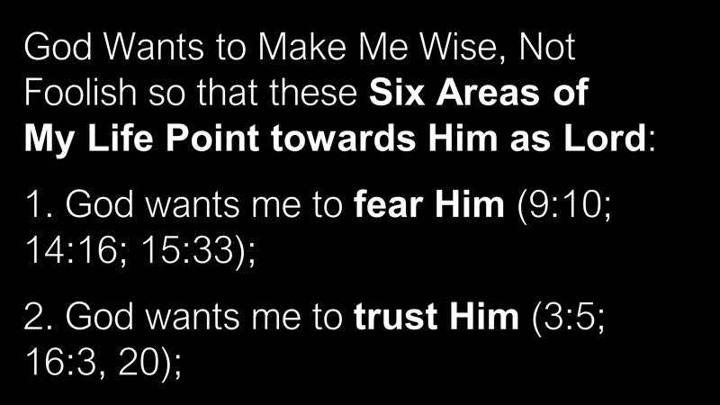 Next slide. God wants to make me wise, not foolish, so these six areas of my life point toward Him. Number one, God wants me to fear Him. That's basically what Proverbs 9:10 says.