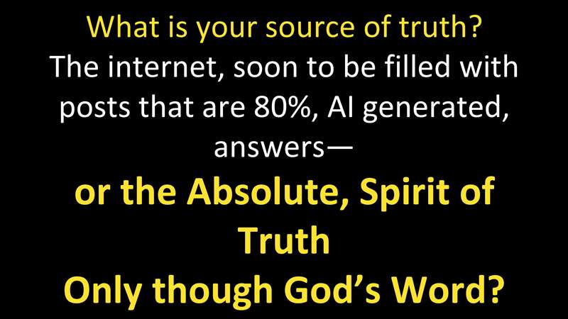 So, what does that mean? Well, is your source of truth are the answers that you have need of built on the internet and AI generated whatever comes out that they can get your attention with or the absolute Spirit of truth that only comes through God's Word? See, the Spirit of truth leads us into all truth through the Word of truth.