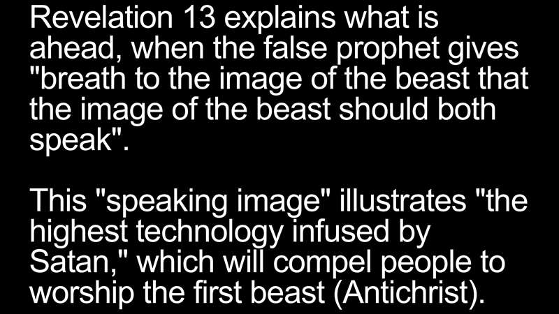 Now look what the Bible says. Revelation 13 explains what's ahead when the false prophet gives breath, as the Bible says to the image of the Beast, so that the image of the Beast should speak. What is that? Well, this speaking image illustrates the highest technology of the day infused by Satan, which will compel the people to worship the first Beast. Who is the Antichrist? This is the second Beast, the False Prophet. This is the first Beast, and Satan, the third member of the unholy Trinity infuses the highest technology.