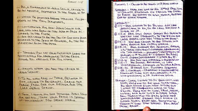 Now, this is me, doing by hand, Romans 1:1-8, so I just hand write it. Then over here you start keeping track. I'm doing the whole chapter called "To Be Saints in a Dark World". I summarize the first chapter, I give the lessons, and now don't worry if you can't read that because the next lesson we're going to be covering chapter one, every verse of it and every implication of it. I'm only telling you about why I'm inviting you to join our Canadians and Australians in this 16-lesson view of probably what's the most important book in the Bible. The book of Romans, if you had to tear out part of your Bible and that's all you could have for good, the one that has everything you need is the book of Romans. Of course, book of Revelation has every attribute of God and every important thing too, but I’m teaching Romans right now. Okay? Back here. So, we're going to cover this next time, all of the important lessons of chapter one.