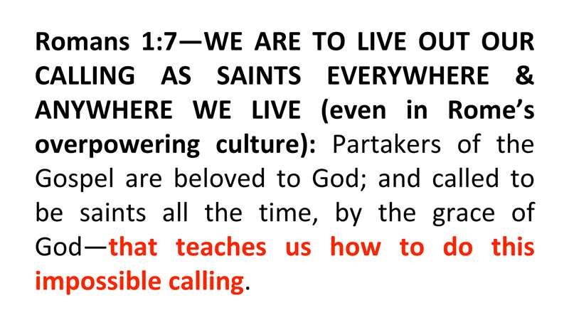 And what we learn is we study this book of this epistle to the Romans we're to live out our calling as saints everywhere and anywhere we live. Look at this, even in Rome's overpowering culture, partakers of the Gospel are beloved to God. We're all called to be saints, and we're supposed to be saints all the time. It only is happening by the grace of God and the grace of God teaches us how to do this impossible calling. So especially to my students that are in Canada and Australia, which are not particularly friendly to the Scriptures or the Gospel message, to them I'm telling them this is how we live and this impossible life.