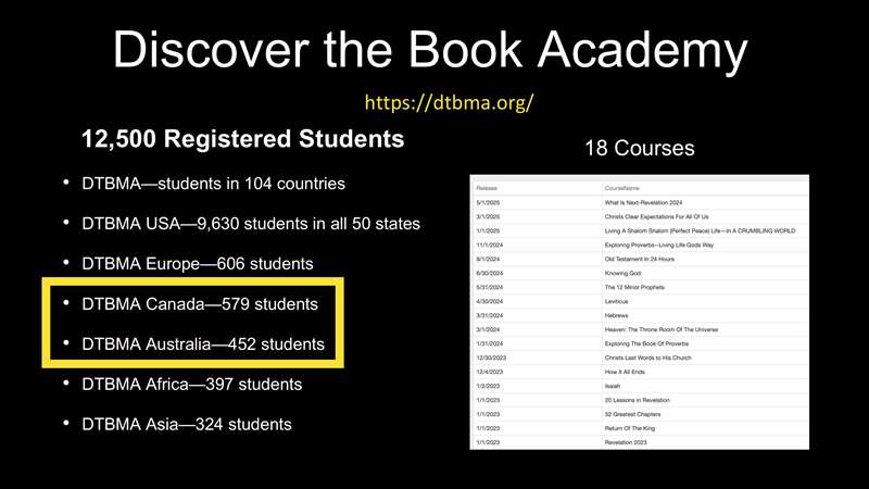 Discover The Book Academy, and right there is where you can find it online, is a ministry that's totally supported by all of those of you that support Discover The Book and I thank each one of you. But we have now, as of this morning, 12,500 registered students. That means that they have gone to that website, that they have filled out their name and their email address, and that they have agreed to what it says you agree to on the website when you join it that we can contact them. And they're immediately into the Discover The Book Academy that I've shown you many times. That Academy has 18 courses. The 52 Greatest Chapters and the Book of Revelation and the Book of Isaiah are our most popular courses. But look who's enrolled, and this is what's fascinating to me. We have students in 104 countries, all 50 states, many in Europe, many in Africa, many in Asia. But look at this. 452 in Australia, 579 in Canada. So that means Canada our close, just above the northern border friends that live in Canada from coast to coast are the largest subscribers to the Discover the Book Academy courses.