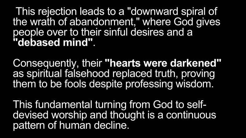 Next, the rejection leads, and this is what we're going to see next time, to the downward spiral, the wrath of abandonment, where God gives people over to their sinful desires in a debased mind. And their hearts were darkened and they become fools despite professing wisdom. And this is into self-devised worship. And that's the continual pattern of human decline.
