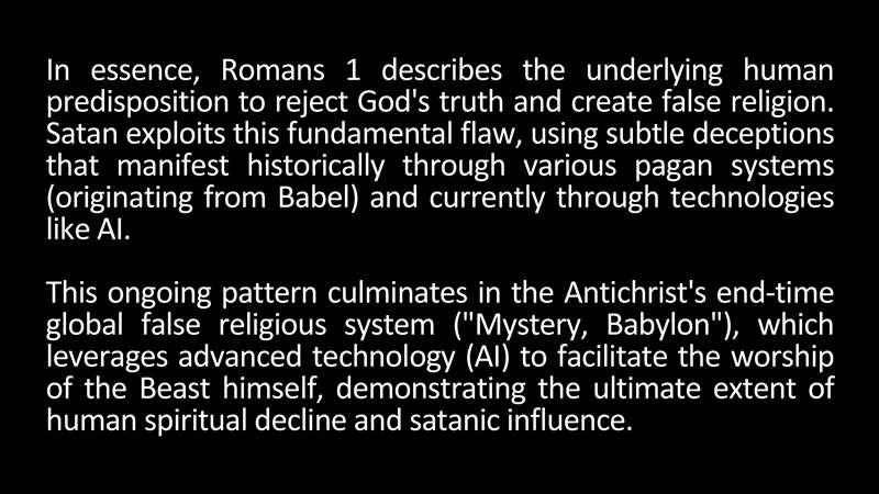 So, in essence, we're going to see next time, Romans 1 describes the underlying human predisposition to reject God's truth, to create false religion. Satan exploits this fundamental fall flaw in humanity using subtle deceptions that manifest historically through all the pagan systems that originated from Babel and currently through technologies like AI. The ongoing pattern culminates in the Antichrist End Time global, false religious system. The Bible calls it Mystery Babylon, which leverages and advances technology currently as AI to facilitate the worship of the Beast, demonstrating the ultimate extent of our spiritual decline into satanic religion.