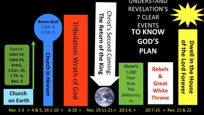 The Book of Revelation. See, right across here is the Revelation chapter divisions. The Church on Earth is where we are right now. The next event that we have to factor into every decision we make is Jesus promised that He's going to prepare a place and He's coming back. He's going to come back the way He went, just like as shown us in Acts chapter one. 1 Corinthians 15 says He's going to change our bodies. 1 Thessalonians says that the dead in Christ will rise first. And Revelation 3 shows us that He is going to spend time with us in Heaven doing this. He's going to determine whether or not we live by absolute truth as all of these events unfold, the Tribulation, His Second Coming, His earthly rule He promised, His judging of all the lost, and His beginning of our time with Him together forever in Heaven. So that's history that God wrote. That's absolute truth in an artificial world.