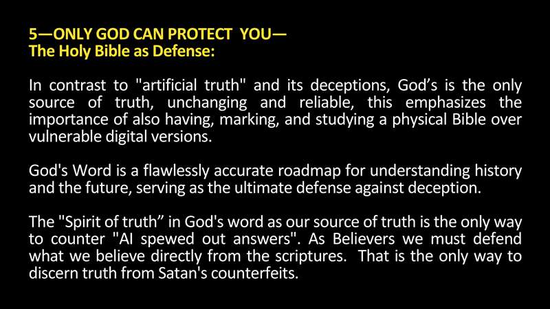 But here's the whole reason for this study. Only God can protect you. So, the contrast, artificial truth is that God is the only source of truth. He's unchanging, He's reliable. That's the importance of having marking and studying a physical Bible over vulnerable digital edition. Guess what? Most things are stored in the cloud. What's going to happen when the Antichrist selectively edits everything that's stored in the cloud that everyone uses all their apps and all of their files, hardly anything you can update and have it on your device? But every time you get a new device, you have to make a cloud copy and then download it unless you want to use those bulky, storage devices. Do you understand what I mean? Convenience, comfort get it done quickly is leading most people to not really have a marked up personal copy of the Bible to not have a well-worn study Bible.