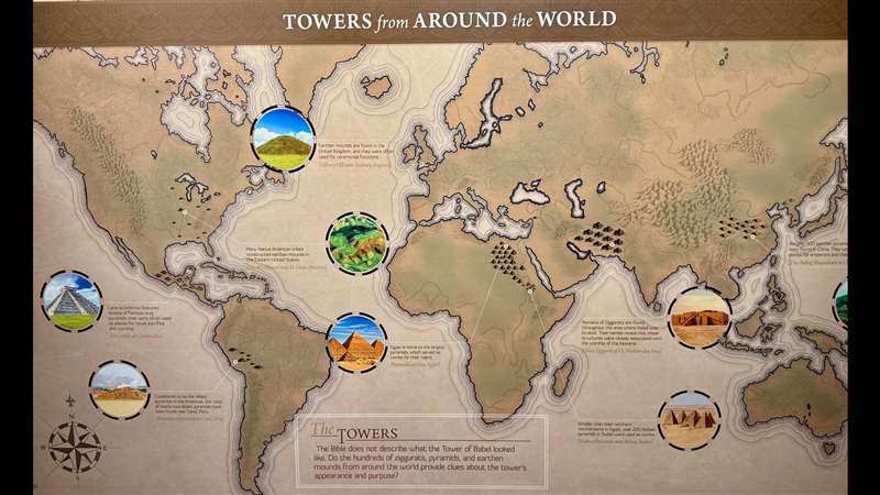 Now, back to the Answers in Genesis, AIG, can't say enough about them. This is one wall showing the post-flood world and how from the Tower of Babel, it spread out into all of these structures, Egypt's pyramids, all of the structures we find in far off places, in Asia, in the islands. Of course these are the pyramids here, but there are pyramids that are over here. There are pyramids in Mexico. There are the Cahokia Mounds and all of the stuff that was going on in the Americas. All of those things are the towers are just part of the remnant from Babel.