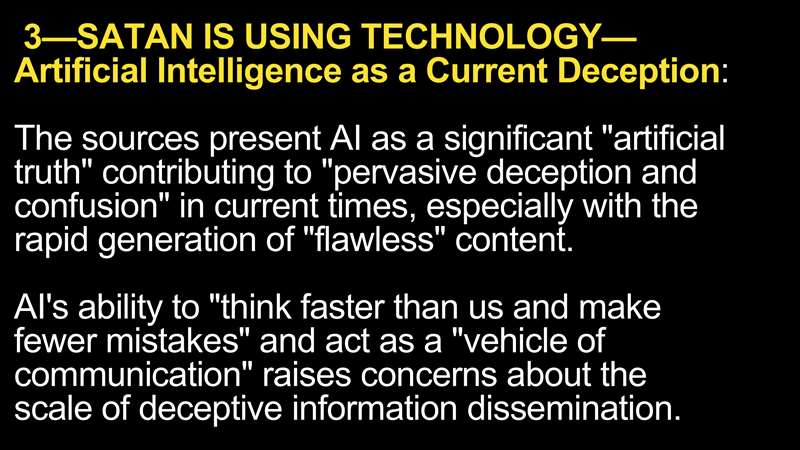 Now, point 3, Satan is using technology. Satan used the technology of Genesis, the building of towers, to lead the world away from God. Satan always uses the current technology. Let me stick to the sides or we'll never get done. Satan is using technology. Artificial intelligence is one of his current deceptions that he's using. AI, if you read what the news says, is a significant source of artificial truth. This is what I say, it leads to pervasive deception and confusion. And the reason is because people look on the computer as giving flawless content.