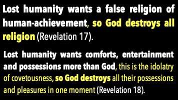 Lost humanity wants false religion, so God destroys all religion. That's chapter 17. Lost humanity wants comfort and entertainment, and possessions more than God. That's the idolatry of covetousness. So, God destroys everything in a moment in chapter 18, and then look what happens. As Paul describes it, in flaming fire, taking vengeance on those that know not God nor obey him. That's what the Second Coming is. Followed immediately by the fulfillment of 28% of the Old Testament of Jesus literally ruling the Earth. Then after a thousand years, almost all humanity won't follow Him.