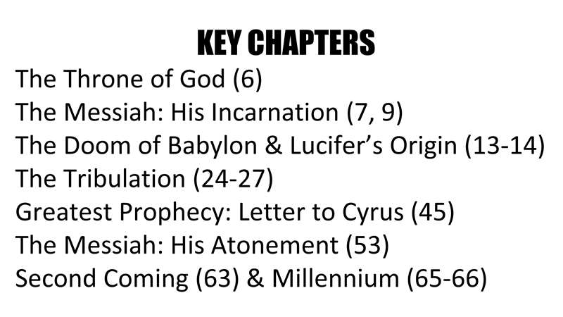 The next slide reminds you of the key chapters. These will be on your quizzes, those of you taking this for credit. So, you might have a matching. You would have these numbers in the left column, 6, 7-9, 13, 14, and then in the right you'd have, the Messiah. For the Messiah you see it's twice. So, you'd have to read more than the Messiah and see if it talks about His incarnation, that's in 7-9. Or about His atoning death, that's in 53, but it'll be the key chapters. We're going to cover all of them but in your quiz, you're going to need to know those chapters.