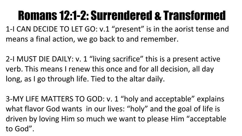 Now look at your slide. These are the summary of the points I found. Number one, I can decide to let go, verse 1, I can present. By the way, I used all the tools and wrote it's in the aorist tense. It means, a final action, we go back to and remember. So, I can decide to let go of the control of my life. So, I wrote in my journal, I can decide to let go. I noted where I found it and I even write down anything that comes to my heart as I'm doing this.