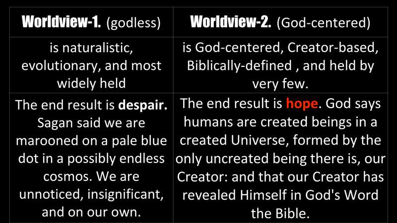 Worldview that's godless. Most of the people around us, they're naturalistic, they're evolutionary. Most people believe this. Most people are headed toward more and more despair. Carl Sagan said, we're marooned on a pale blue dot in an endless cosmos. We're unnoticed, insignificant, not our own, which is absolutely wrong. This is what Romans offers us, and God offers us a God-centered, creator-based, biblically defined, held by the few, which results in endless hope.