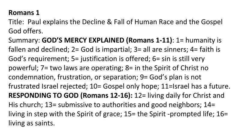 Back to the slides sitting around the table. We're at Panera or Starbucks. The first 11 chapters is God's mercy explained. And I talk about humanity has fallen. God is impartial, all are sinners. Faith is God's requirement. He offers justification and sin is still very powerful. Even after we're saved, the two laws are operating within us, in chapter seven, the Spirit of Christ makes us so we have no condemnation, no frustration, and no separation from God. Chapter nine, God's plan is not frustrated even though Israel rejected Him. God gives a Gospel of hope and he concludes this with Israel as a future. So that's the first half what we call the doctrinal half of Romans. Now, this is the practical. How do we respond to God? And we're going to see in the weeks ahead, 12 through 16, He wants us to live daily for Him, submit to authorities, live in step with the Spirit of grace and other believers, live a Spirit-prompted life, and live as saints willing to suffer.