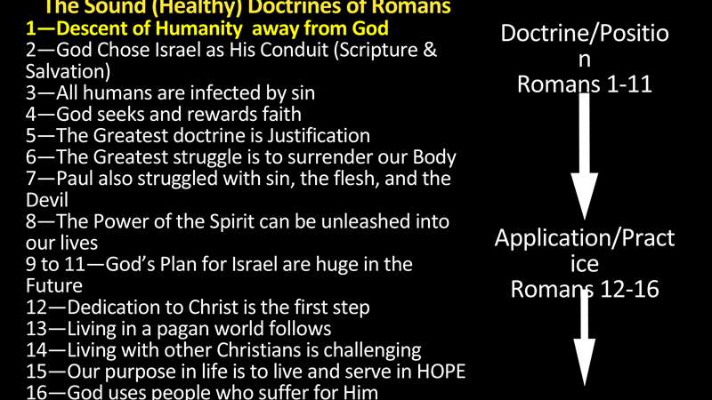This is our overview of Romans; see the sound and I'm talking using the terminology from the book of Titus. Do you remember how Titus is that we're supposed to have healthy doctrine, sound doctrine so sound or healthy doctrines? What are they? As we go through Romans, here are the chapter numbers. This is the chapter we're in and it's the doctrine of the descent of humanity away from God. And what's so important about that is it explains everything.