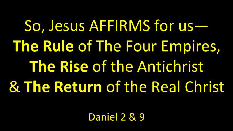 But Jesus affirms for us the rule of the four empires, the rise of Anti-Christ out of the final form of the Roman empire, and the return of the real Christ to destroy the Anti-Christ.