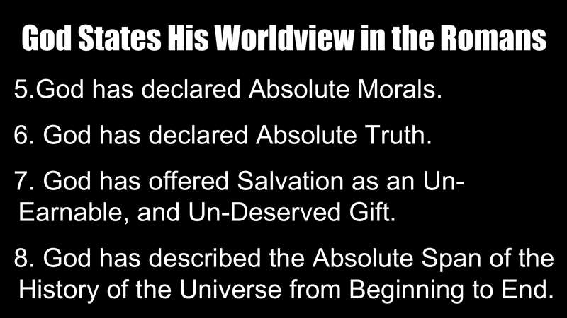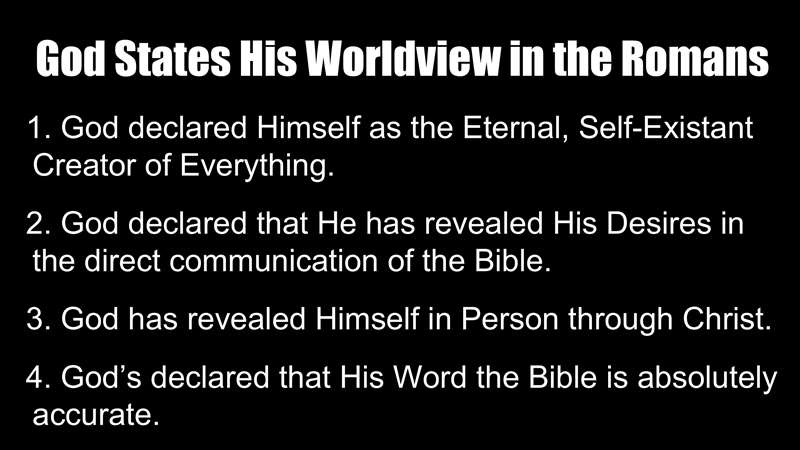 God states His worldview in Romans. He declares Himself, and we're going to see as we go through this, the attributes of God. He's eternal, self-existent, creator of everything. He's revealed His desires in His direct communication of the Bible. That's what God desires. He's revealed Himself. Remember, He, Jesus, is the exact representation of God. Hebrews 1:3 tells us that, and the book of Romans defines that in so many ways. He declares His Word is breathed out holy Word of God.