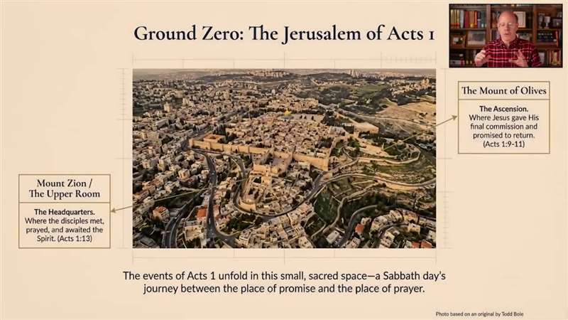 This is just an overview of the Book of Acts, and it starts between the Mount of Olives and Mount Zion, everything we're reading about.