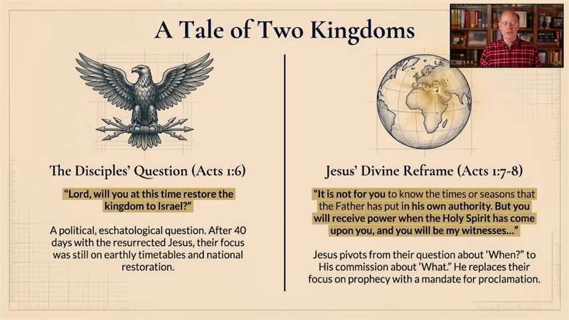 Now look what the disciples say, Lord, will You restore at this time the kingdom to Israel. What was their question? They were totally thinking about Earth and so are we so often. And look how Jesus reframes them in verses 7 and 8 and says, it's not for you to know the times the Father has put in His own authority, but you shall receive power when the Holy Spirit has come upon you to be My witnesses. We're supposed to not be concerned about the worldly kingdom, but the heavenly kingdom. That's why we're here.