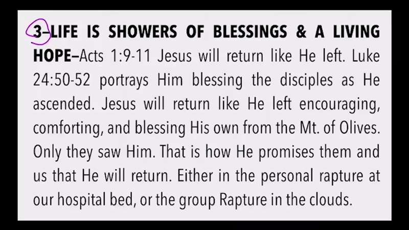 3. Showers of Blessing and Living Hope (Acts 1:9-11; Luke 24:50-52) How did Jesus leave this earth? With His hands raised, raining down blessings upon His disciples. Because Jesus promised to return in the exact same manner He left, your life from the instant of salvation is meant to be lived under a constant shower of Christ's blessings. Whether He comes for us all in the clouds or personally takes you home from a hospital bed, you are eternally secure and filled with endless hope.