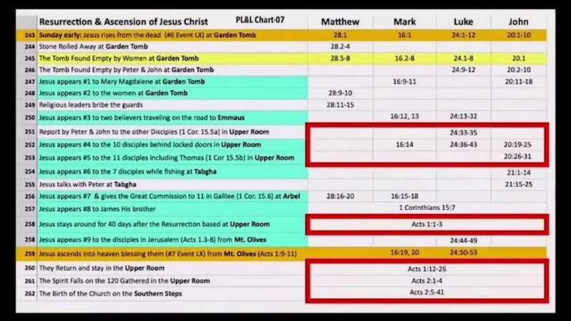 Okay, the Book of Acts picks up where the Gospels end. Now you remember, this... see what this is? P, L, and L. That's Paul's Life and Letter chart number seven. Remember that's available for you, and I'll show you in just a second where, but this is from our Holy Land class, the same chart where we take Matthew, Mark, Luke, and John, and show all the events either at 262 events that are covered in the Gospels, and look, it shows which one of the four Gospels up here records it. Now these are showing you the Upper Room because that's where actually the Book of Acts begins. And look, here it is. It's event 258. Jesus stays around for 40 days after the resurrection, basing His meeting with the disciples in the upper room. And that's where we're going to start in Acts 1:1-3. And then, the disciples go from 3-8 to the Mount of Olives. We're going there next. And then from there, Jesus ascends from the Mount of Olives to Heaven. They go back to the Upper Room, and so basically from here to here is our whole lesson today. And then when we come back, next time, they're gathered in the Upper Room, the 120 in chapter 2, and they go to the Southern Steps, and that's the day of Pentecost. So that's for you to understand Acts chapter 1, it picks up right here where the Gospels end and tells us the rest of the story.