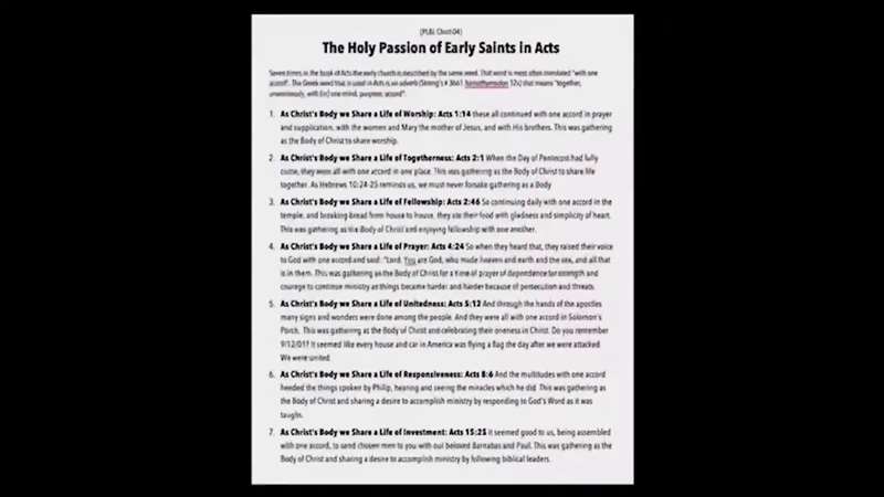 Look at verse 14. As Christ's body, we share a life of worship. This is the holy passion of the early saints. Look back at my Bible. See how I wrote number one right here. Now look in chapter 2, verse 1. I wrote, number two, passion for fellowship. Then look at chapter 2, verse 46. Number three, passion for worship, right there. Then look over in chapter 4, verse 24. 23, 24. Number four, a passion for needing God. Then look at chapter 5, verse 12. They were with all in one accordance, Solomon's porch. They had a passion for fellowship.