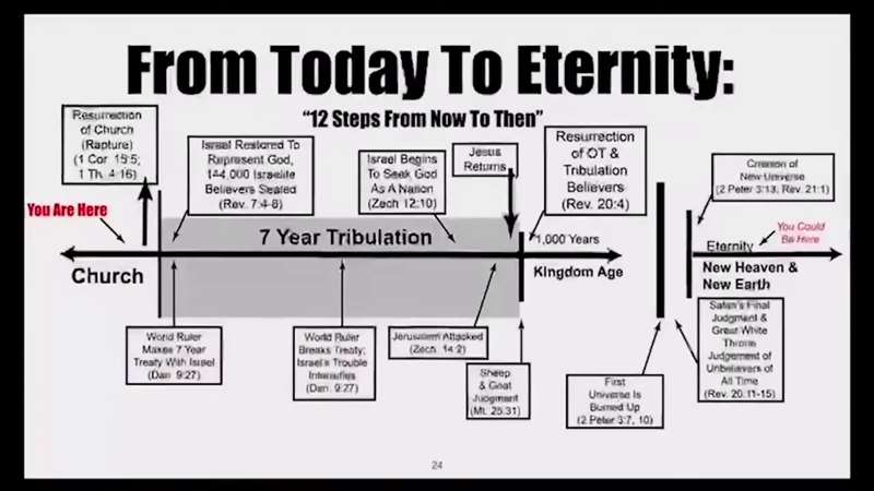 Now, this is what the disciples wanted to know. They want to know when is the Tribulation coming and when is the Millennium coming, that's Christ literal rule. And Jesus said, don't worry about all that, you're in the Church. You are supposed to be my witnesses. I am going to do all this that I have planned. He's going to restore. His representatives. There's going to be the rise of the Anti-christ, he's going to make a covenant and break it. Israel's going to seek the Lord. Jesus is going to return as Jerusalem is attacked. There's going to be a judgment. Old Testament saints are going to be raised at the end of the Millennium. The universe is going to be burned up. God's going to make a brand new universe. Satan and all the rebels are going to go into the Lake of Fire. And look, this is our endless hope, we have life with Jesus.