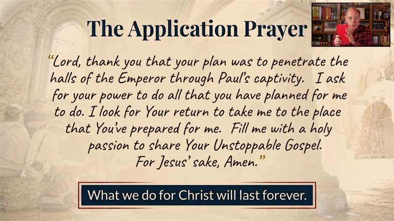 Lord, thank you that your plan was to penetrate the halls of the emperor through Paul's captivity. I ask for Your power to do all You've planned for me to do. I'm looking for Your return to take me to the place You prepared for me. Fill me with a holy passion to share Your unstoppable Gospel for. Jesus' sake, amen.