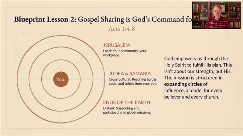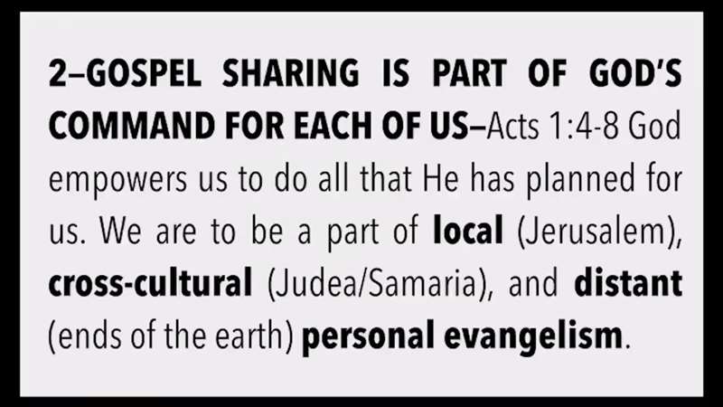 The second lesson, Gospel sharing is God's command for each of us. That's what I just quoted to you in verse 8. Once we're saved, we receive power to be His witnesses. And as I've told you before the three concentric circles were, Jerusalem, Judea and Samari, and the uttermost parts of the Earth. And we, you and me right now, are called and commanded and equipped and empowered to go for the Lord.