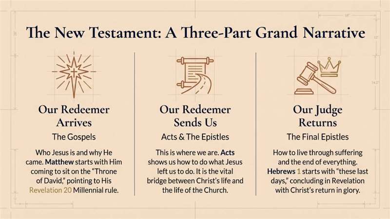 But the New Testament itself has a three-part grand narrative. Our Redeemer arrives, that's what the Gospels are about. Our Redeemer sends us, and that's what we're looking at right here in the Book of Acts and all the way through the 13 epistles that are segmented all the way through the Book of Acts. And then the final epistles, out Judge returns.