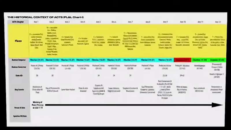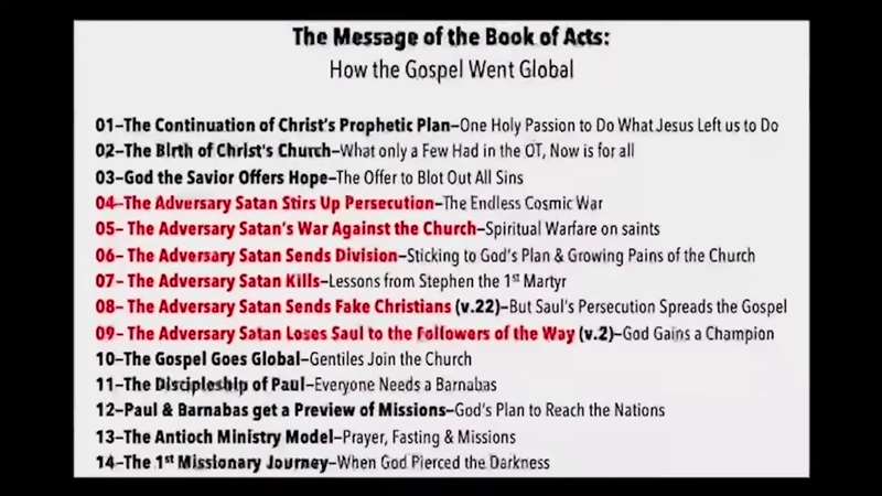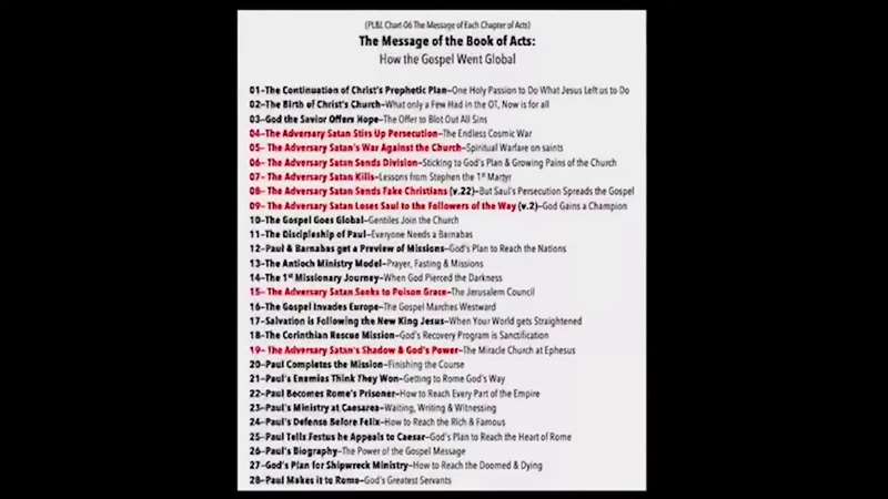 Okay. Back to the slides. So, this is the message of the Book of Acts. So, this is chart six. It's the message of Acts, how the Gospel went global. Now look, here are the 28 chapters of the Book of Acts. Let me just go through them with you one at a time.