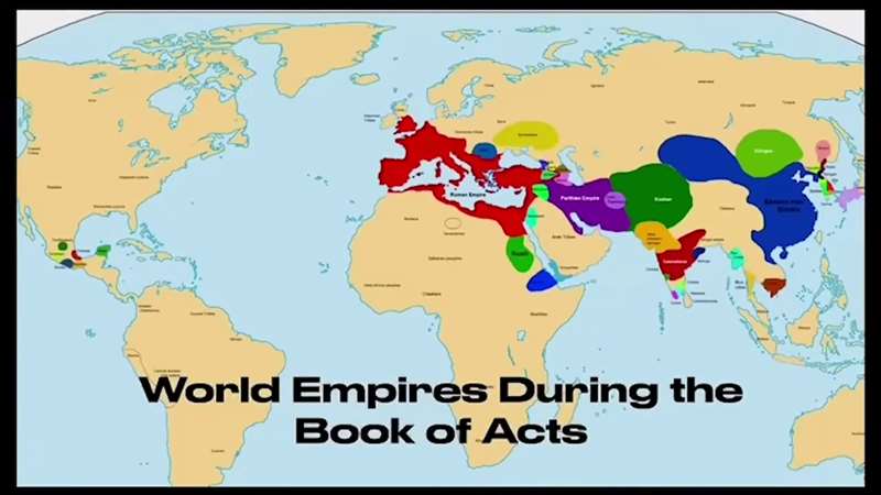Now, what is going on around the world during the Book of Acts? The bright red here is the Roman Empire. Notice it's even up here into Britain, all across Northern Africa, surrounding the Mediterranean Sea. But not a part of the Roman Empire is Sarmatia. That's what we would call the Ukraine right now. The Parthians were always fighting with the Roman emperors. And you can see all these others. The Chinese. There were all kinds of empires. Look, even over here in, in Mezzo America and the Yucatan and in Mexico there are civilizations. There are all kinds of people groups all over the world in the 1st century, but this is God's focus for the scripture. He wants the Gospel to go to all of these places, and that's what the Book of Acts is about, how He accomplishes that.