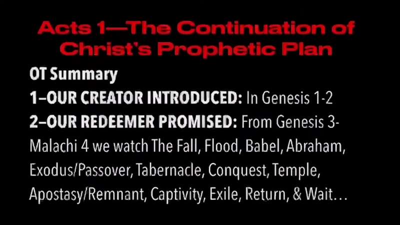 Acts 1 is the continuation of Christ's prophetic plan. If we summarize the Old Testament like Paul does, in Acts 17 Paul gives a three part outline of the Bible. He says chapters Genesis 1 and 2 is about our Creator. From Genesis 3 all the way through Revelation 5 is about our Redeemer. And then of course, Revelation is about the Judge. Our Creator introduced in Genesis, our Redeemer's promise from Genesis to Malachi.