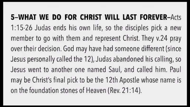 Okay, we've got to finish last lesson in chapter 1. Here it is, what we do for Christ will last forever. Starting in Verse 15, Judas ends his own life, the disciples pick a new member, they go on and represent Christ. In verse 24, they pray over their decision. God may have had someone different since Jesus personally called to 12. Judas abandoned his calling, so Jesus went to another one named Saul, called him Paul, and he was probably the pick to be the 12th apostle. Most likely Paul's name is on the foundation stones of Heaven in Revelation 21:14. All of that is just a reminder what we do for Christ will last forever.