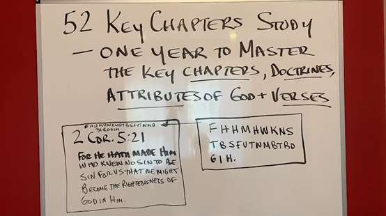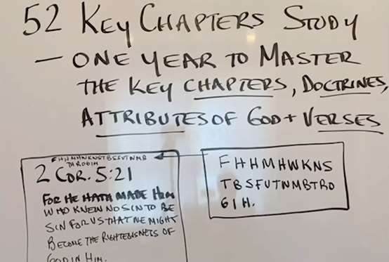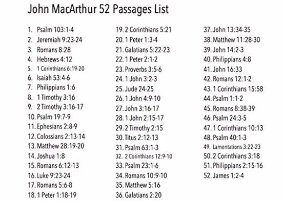 Now back to this verse, you can memorize the English. It's only 15 words in Greek. I use the first letter method. "For He made Him who knew no sin to be sin for us, that we might become the righteousness of God in Him." Those little letters that are here on my verse card helped me not to miss any of the words. Remember, every word of God is pure. Every word of God is inspired. Every word of God has the very power of God. Jesus said, sanctify them through the truth. "Thy word is truth." That is why we need these verses to be memorized. Here's the list. These 52 key passages can become for you the essence of understanding all of God's plans for us. It has what Dr. John MacArthur has concluded after his lifetime of study, one passage for every week of the year. If you learn these verses, you have learned what is the group of most vital. These are the most vital verses in the Bible.